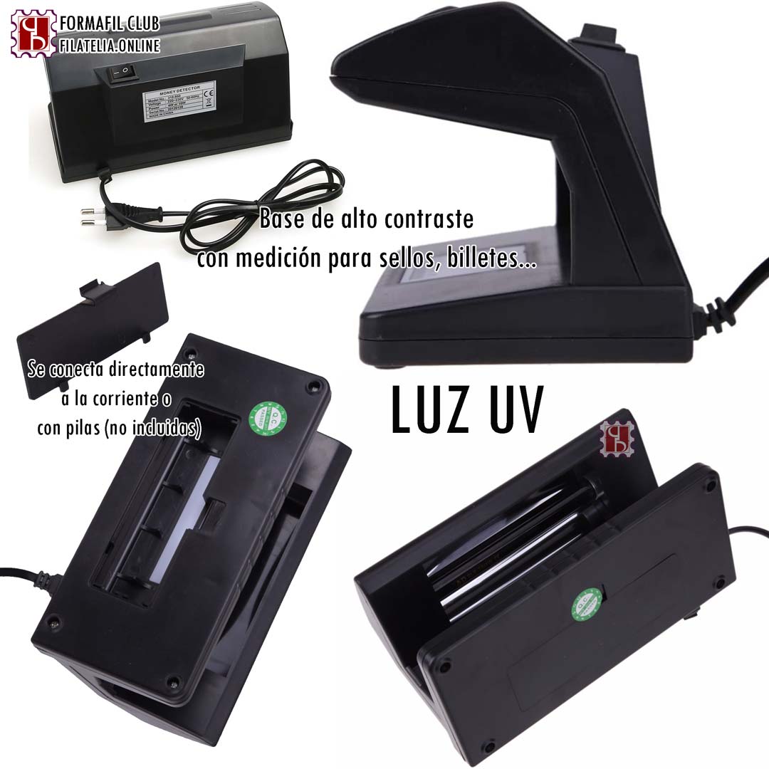 Linterna de mesa, de luz UV de 4W y 10W para observar detalles inapreciables con luz natural. Podrás detectar fácilmente diferencias entre tonalidades, rasguños o manipulaciones. También sirve para localizar marcas filatélicas, sellos con fósforo, marquillas, óxido, reparaciones ocultas, sellos reengomados...