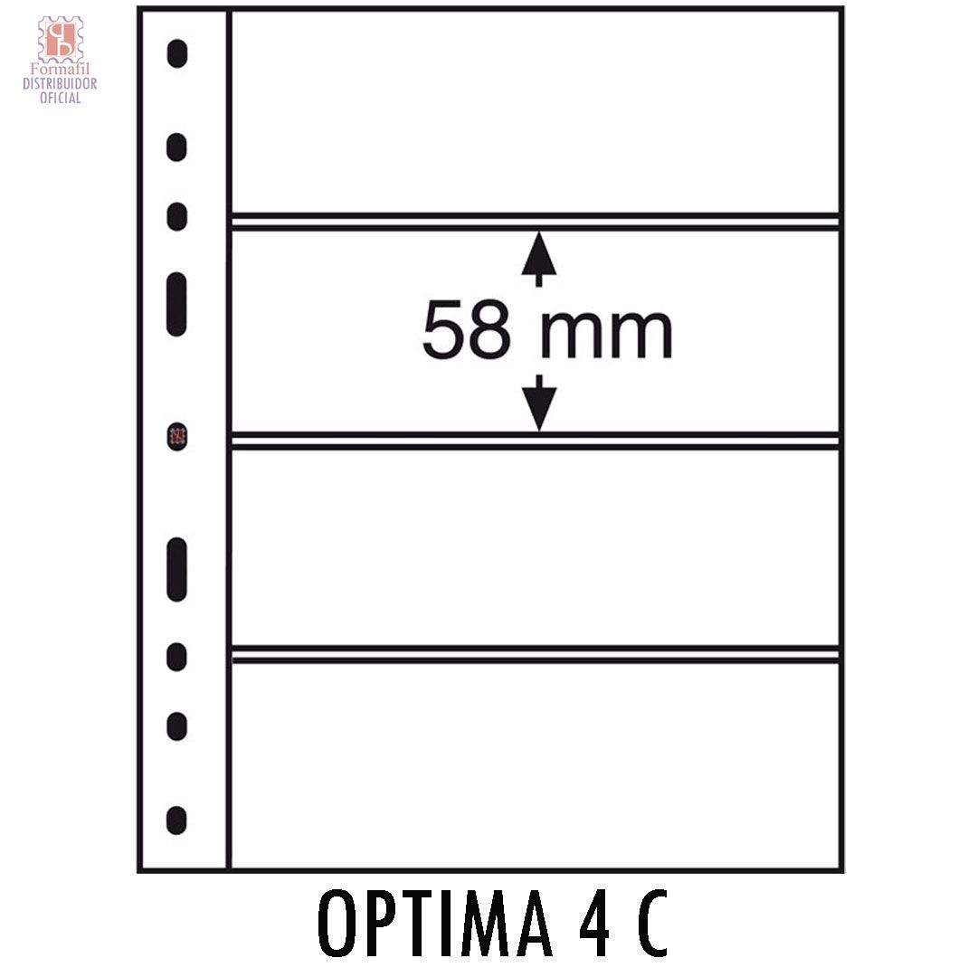 El modelo de hojas clasificadoras OPTIMA 4 C dispone por cada hoja de cuatro bandas. Aunque el formato exterior de la hoja es de 202x252mm, cada banda tiene una longitud de 180mm y una altura de 58mm. Al ser transparente, permite ver el anverso y reverso del sello/vitola/billete introducido. Si no se requiere ver anverso y reverso, prefiriendo tener el doble de capacidad, se recomienda el modelo óptima 4S (negro).