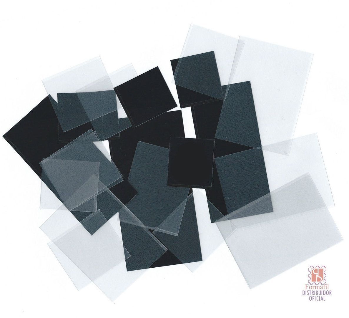 Todos los paquetes pesan 100gr. En un paquete variado pueden venir desde 120 filoestuches (si hay muchas medidas grandes) hasta 300 estuches (si van muchas medidas pequeñas). Es recomendable tener una cizalla o una gillotina para ajustar los estuches a la medida de los sellos que se quieran conservar.
